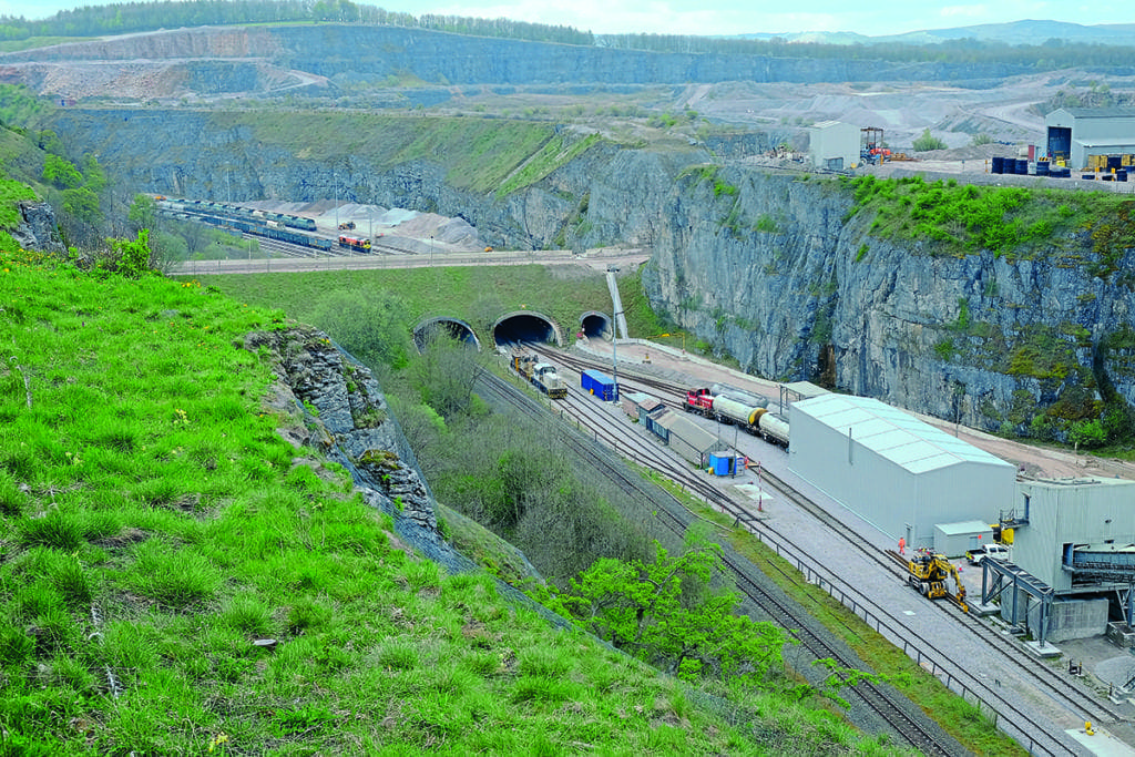 Every year, Tarmac’s Tunstead Quarry blasts, shovels, crushes and dispatches around six million tonnes of Derbyshire limestone to feed British industry. Of that massive total, 50% is taken away by rail in various forms.