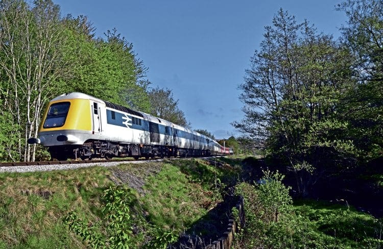 With all appearing to be well, prototype HST power car No. 41001 climbs the valley towards Damems with the 08.30 from Keighley to Oxenhope on May 4. This was the first southbound train of the morning on the second day of the KWVR’s mixed traction gala. Stock comprises the 125 Group’s Mk3s with resident Class 20 No. 20031 on the rear. BEN BUCKI