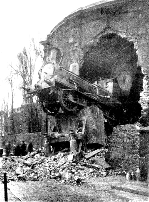 The locomotive was seen, amid a shower of falling masonry, to push on through the aperture, and come to a stop, suspended in mid-air, 30 feet over Hatch Street. Our illustration shows the 6-coupled goods engine thus suspended, with the tender in end behind it, and the massive stop-blocks in the street below.