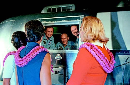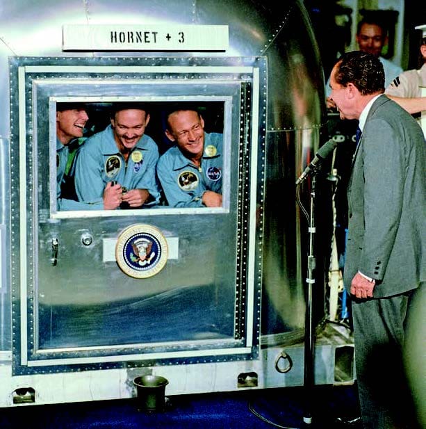 picked up off the Moon. All three crew members were put in a Mobile Quarantine Facility before a welcome by President Nixon. Flown to the Lunar Receiving Laboratory in Houston, they spent two weeks in isolation before the quarantine was lifted.