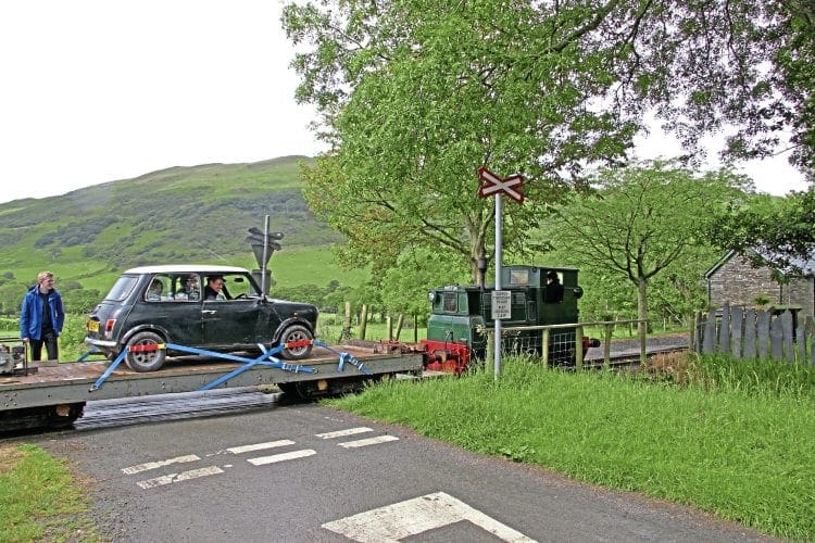 Talyllyn engineering manager Chris Smith sits in the driving seat of his Mini as it crosses the road at Brynglas – at 90° from what one might normally expect! The train is being hauled by Ruston & Hornsby 4wDM No. 5 Midlander. CLIFF THOMAS