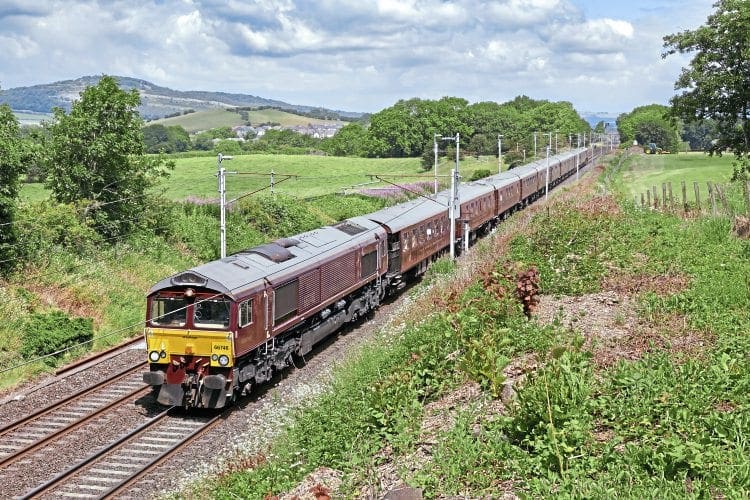 On the third leg from Edinburgh to Chester on July 7, No. 66746 leads the train through Carnforth.