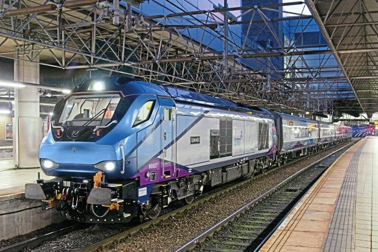 A piece of history as the first ‘Nova 3’ set begins passenger service, the 05.55 Manchester Victoria-Liverpool Lime Street, led by Class 68 No. 68027 Splendid. TONY MILES