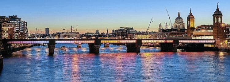 Network Rail’s Cannon Street bridge is one of the initial quartet featuring multi-coloured lighting, as the result of a collaboration between London-based and international creative artists and around 50 organisations.
