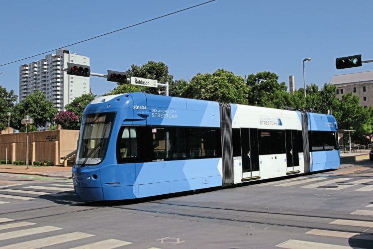 Oklahoma Streetcar 201804 leaving the Memorial Museum stop running on battery power in Oklahoma City on June 28. Behind the tram is the site of the Alfred P Murrah Federal Building. It was destroyed by a terrorist bomb in 1995, which killed 168 people. KEITH FENDER