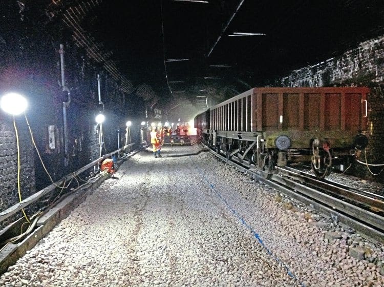 The renewal of more than 1,550 metres of track, sleepers and ballast was carried out over six consecutive weekends, and was complicated by the confined space, limited ventilation, a need to maintain timetabled service during the week, and close proximity to a main sewer.