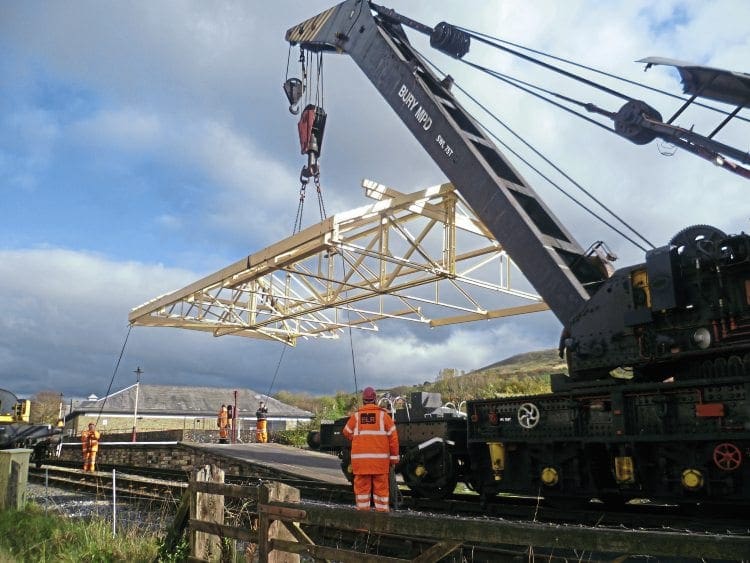 The railway made good use of its Cowans Sheldon 75-ton crane to lift the canopy frame from its fabrication yard alongside the platform, and position it onto two cast iron columns previously set into the platform. The canopy has been made from the materials salvaged from Oldham Mumps, and will provide much-needed cover for visitors using the station.