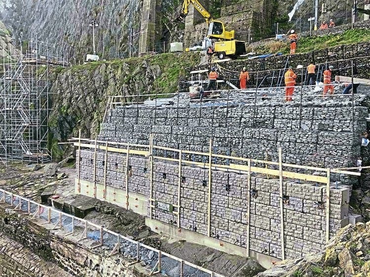 The repairs have primarily focused on the sea defences at Bray Head, which are formed from tiered, stone-filled gabion baskets over a mass concrete wall, with a lower level masonry wall.