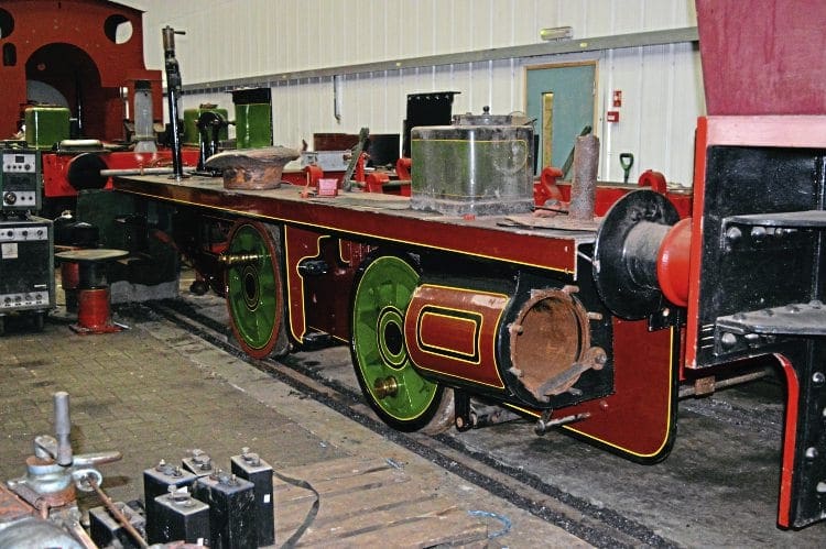 Currently, most of the engine is in the two-road workshop at Embsay, with work having been undertaken on the chassis and boiler (including the manufacture of a new front tubeplate), but the latter component has yet to be re-fitted to the chassis.