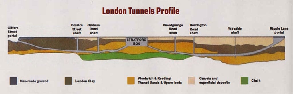 The most easterly stretch was driven by TBMs Maysam and Judy, which bored 5.3km westwards from Dagenham to Barrington Road beneath the LTS Line and District Line. One of the Barrington Road shafts has been left to provide permanent ventilation for HS1.