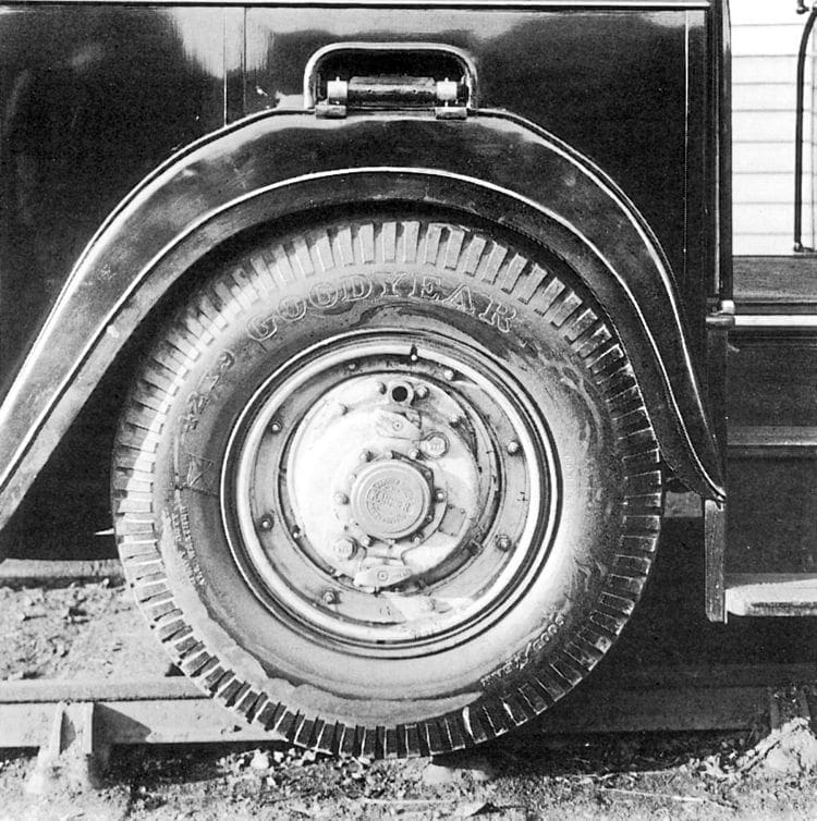 The lorry had a four-cylinder, 31-48hp engine, four-speed gearbox and cone clutch. A prop shaft provided rear axle drive, with mechanical universal joints at both ends, to a worm wheel and differential. Fully floating, high-tensile steel axles, unloaded except for torque, transmitted power to the 32-in rail and 38-in by 7-in pneumatic-tyred road wheels.