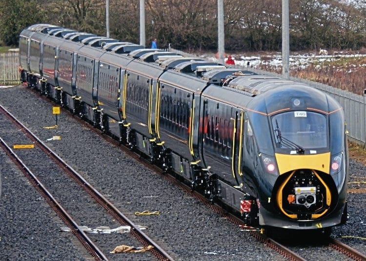 The GWR fleet is being gradually filtered into passenger service after extensive type testing, and is a mix of Class 800 bi-mode five-car (36 sets) and 21 nine-car trains with 25kV AC overhead electric equipment and underfloor diesel engines.