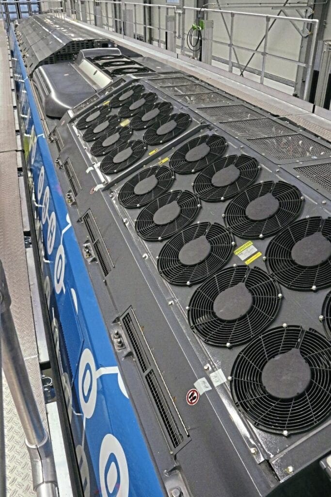 The ‘iLINT’ weighs 107 tonnes without passengers – nine tonnes more than even the most powerful DMU version (which has three diesel power-packs), reflecting the weight of the fuel cells and water plus the batteries to store ‘spare’ energy. The 140km/h ‘iLINT’ Class 654 uses two roof-mounted hydrogen fuel cells and onboard batteries to power two traction motors.