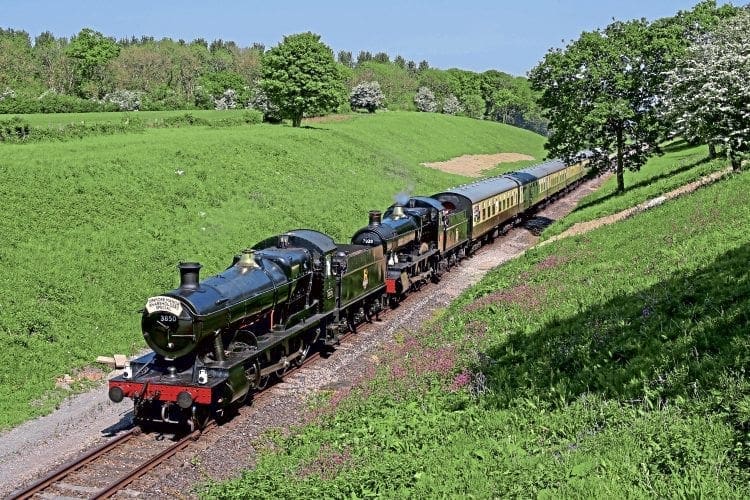 Together in steam for the first time, Nos. 3850 and 7820 pass Dixton, on the approach to Gotherington, with the 14.40 Toddington-Cheltenham Racecourse service on May 17, 2014. BOB SWEET