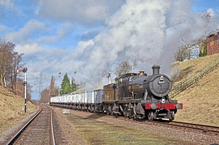 No. 3850 was repainted into BR black in 2010 and fitted with a cast iron chimney.  On February 7, 2011 the loco approaches Rothley with the ‘Windcutter’ rake of 16-ton mineral wagons during a visit to the Great Central Railway. DON BISHOP