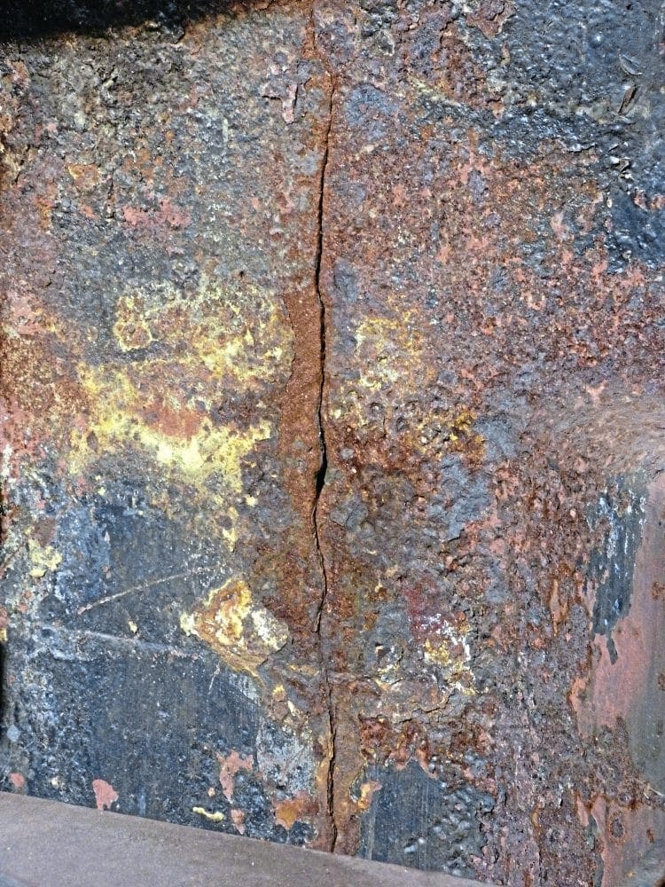 During the strip down a crack was discovered in the front of the fireman’s side (left hand) cylinder block, which upon investigation was found to run vertically almost from the smokebox saddle to the base.