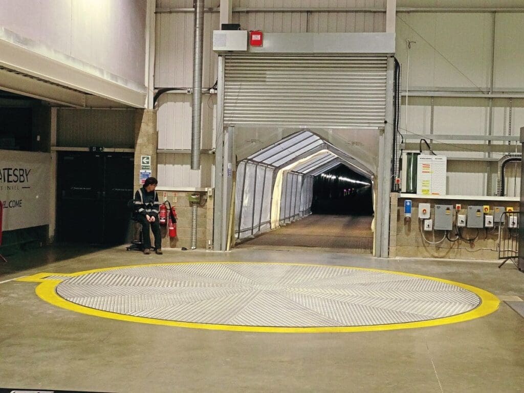 To enable vehicles to turn round and make a return run, automated turntables have been installed at both ends. This one at the south is not actually inside the tunnel but within a preparation facility a few yards beyond the portal – the tunnel can be seen in the background. NICK PIGOTT