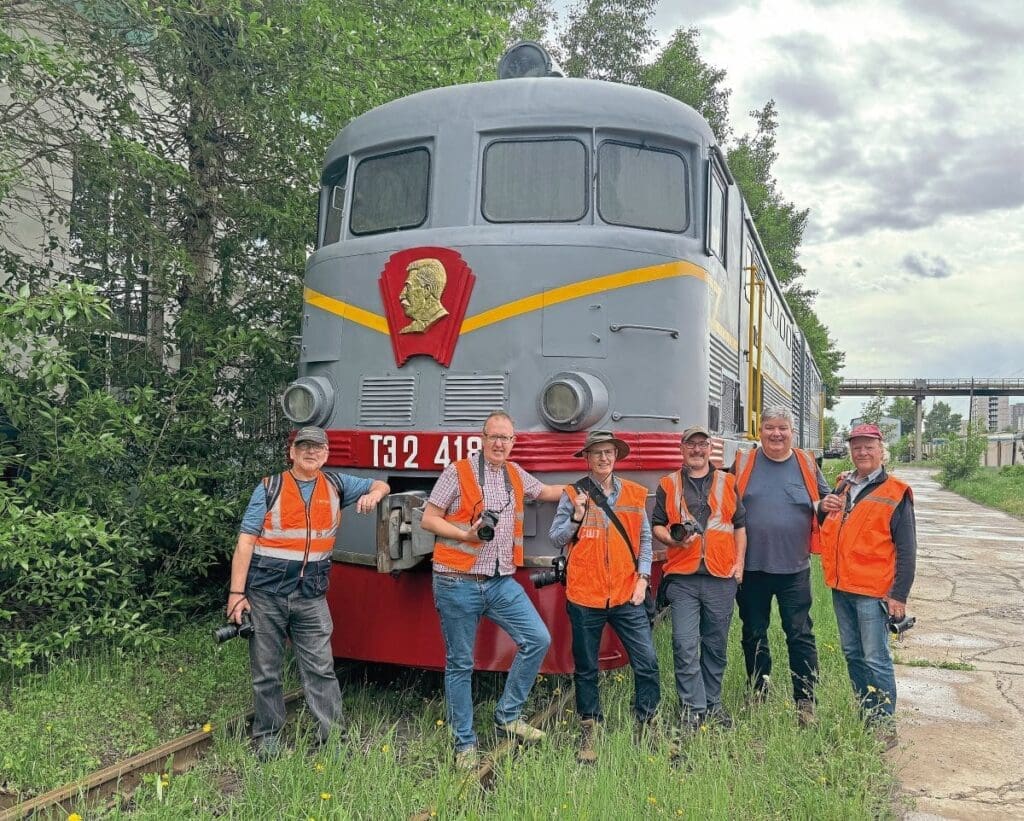 One of the batch of TE2 locos introduced in 1955, No. 418, remains in operational condition as the UB depot mascot and is seen there with the tour group during a visit on June 2 – from left are Peter Hanahoe, Gary Thomas, Jonathan Makepeace, Steve Morris, Phil Thomas, and Brian Bollington.