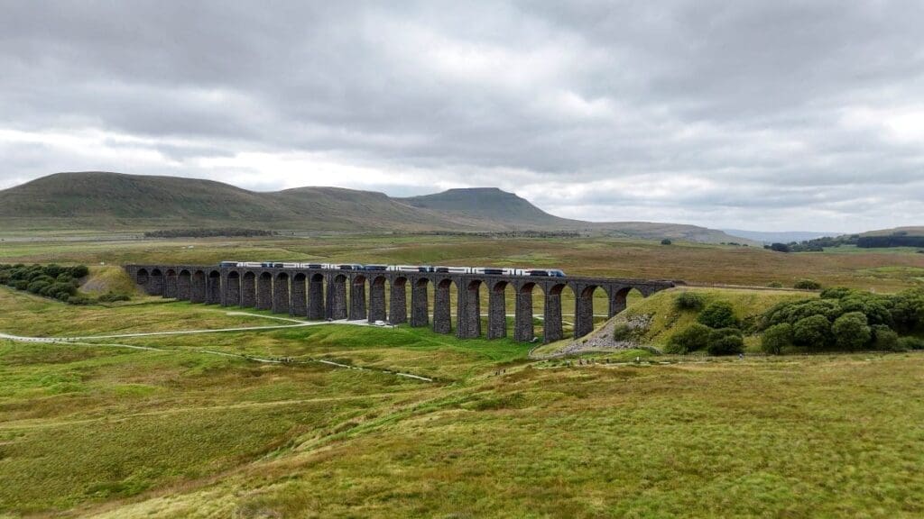 The Settle to Carlisle line crosses the Yorkshire Dales and the North Pennines via the Ribblehead viaduct.