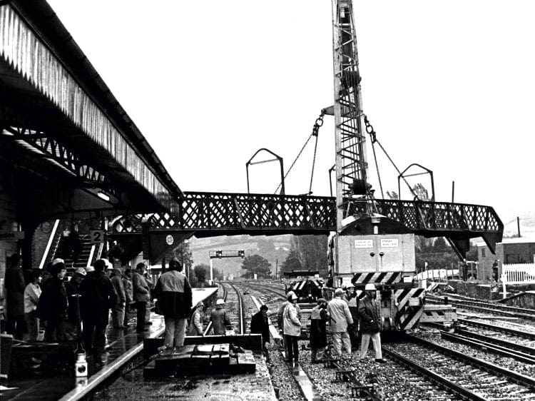A rail-mounted mobile crane has been operating in the Totnes station area in broad daylight and has demolished the station footbridge by trying to pass under it with its jib raised.