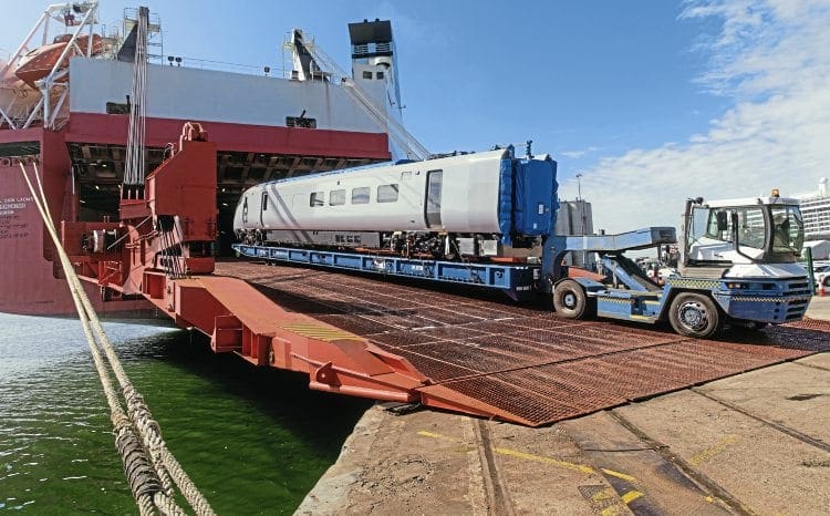 THE first of 19 Hitachi Class 802 Intercity Express Trains (IET) destined for use with TransPennine Express, was unloaded at Southampton on June 11.