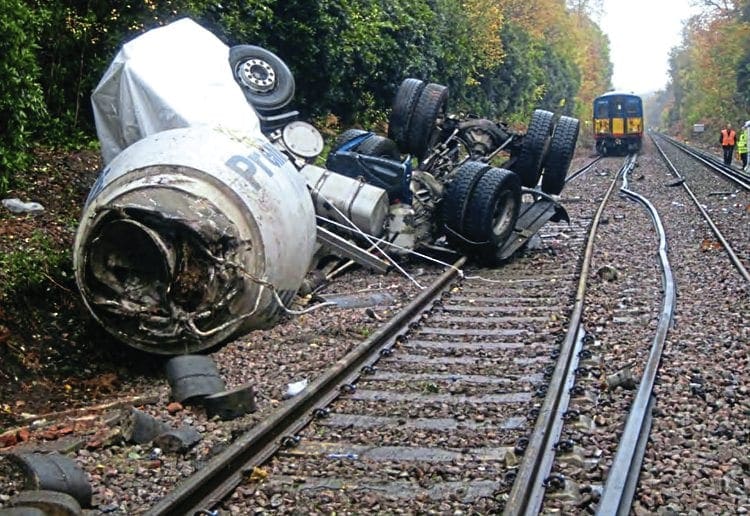 Two such recent incidents were particularly serious. On November 5, 2010, a cement mixer collided with a bridge and partly demolished a parapet at Oxshott, Surrey, the mixer landing on the roof of a passing Class 455 EMU, damaging three carriages.