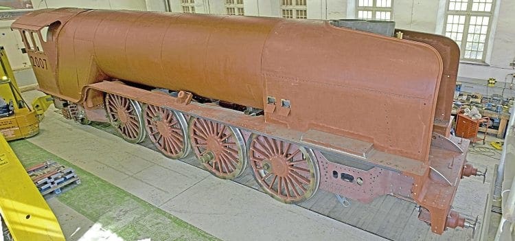 The four completed 6ft 2in wheelsets left the workshops of South Devon Railway Engineering at Buckfastleigh on July 23, and were placed beneath the ‘P2’ almost immediately following their arrival at Hopetown.
