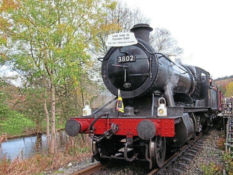 The final train to depart Corwen East was the 15.50 to Llangollen hauled by ‘2884’ 2-8-0 No. 3802, which carried a special commemorative headboard and Welsh flags to mark the occasion.