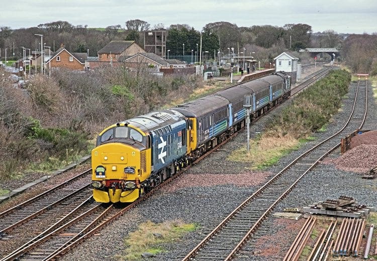 Displaying both ‘The Cumbrian Coast Express’ and ‘Class 37 Farewell’ headboards, Northern’s 09.52 Carlisle-Carnforth special passes Maryport.