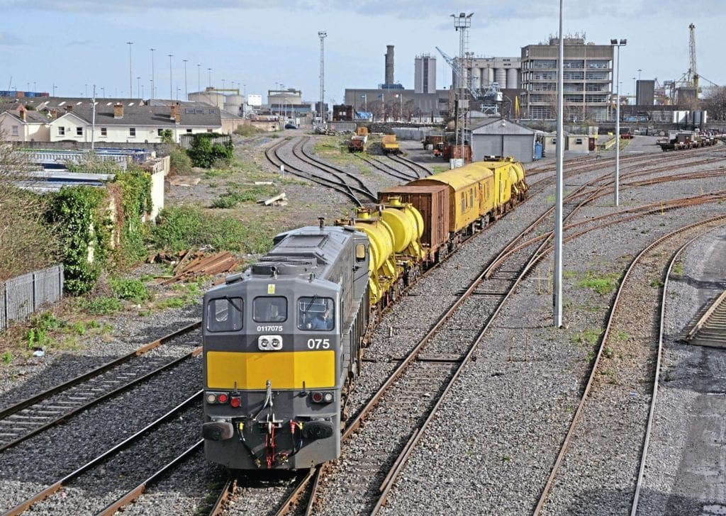 IARNRÓD Éireann’s Sperry ultrasonic testing machine was out on March 5, seen here at North Wall having just arrived from Waterford behind ‘071’ No. 075.