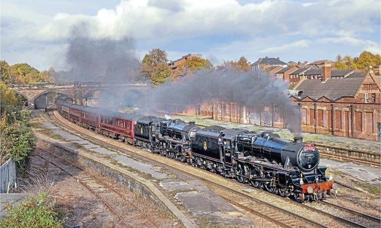 IAN Riley’s Stanier ‘Black Five’ duo of Nos. 44871 and 45407 pass through the remains of the old Masborough station with